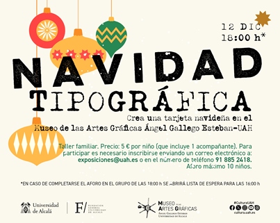 - El Museo de Artes Gráficas Ángel Gallego Esteban–Universidad de Alcalá celebra la Navidad con una edición especial de su taller mensual Cómo funciona una imprenta. En esta ocasión, los participantes podrán diseñar y crear su propia tarjeta navideña utilizando impresión tipográfica y otros elementos decorativos tradicionales de estas fechas..